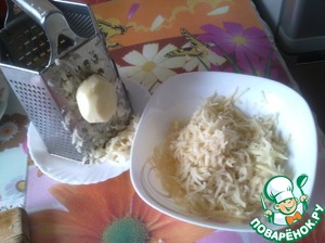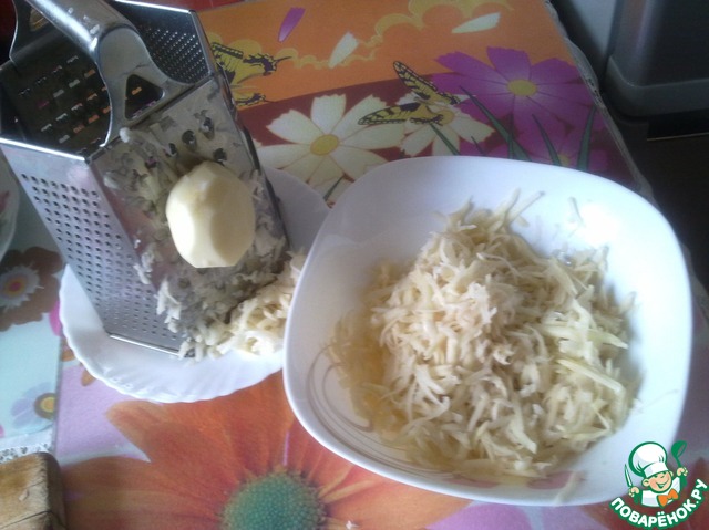 Натрите на крупной тёрке 3 сырых картошины, а затем откиньте на сито, чтобы стекла лишняя влага.
