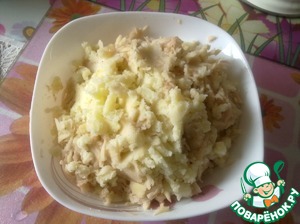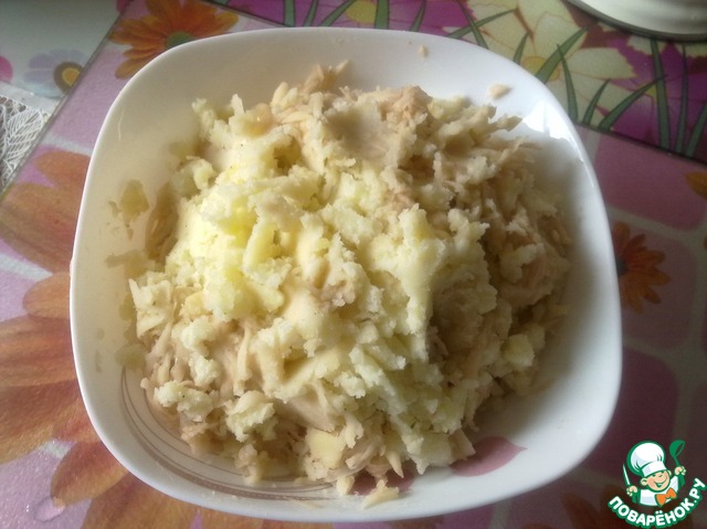 Из отварного картофеля сделайте пюре и соедините его с тёртым картофелем. Если не поститесь, то вбейте куриные яйца, они послужат скрепляющим элементом сырого и варёного картофеля. И так, основа оладий готова.