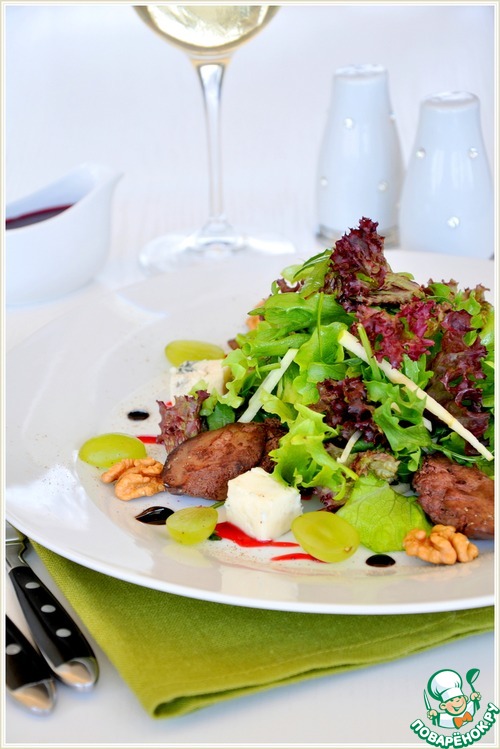 Салат с куриной печенью фламбе, фенхелем и виноградом "La dolce vita". Я большой любитель куриной печени в салатах. При правильном приготовлении она получается безумно вкусной. С припущенным яблочком, с персиком, с хурмой, с черешней уже пробовала и очень понравилось. Давно мечтала попробовать этот рецепт, но все не было повода. Попробуйте и вы - это очень вкусно.