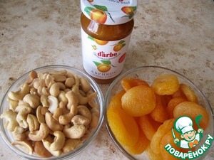 1 ч. л. желатина замочить в 30 мл воды. Смешать курагу (примерно 3 ст. ложки), орехи (3-4 ст. ложек без особого верха), конфитюр (5 ст. ложек).