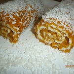 Застывшую основу с кремом аккуратно и плотно свернуть рулетом, завернуть сверху пищевой пленкой и отправить в холодильник до застывания рулета минут на 30-40. Застывший рулет покатать в кокосовой стружке, нарезать на порционные кусочки и подавать к столу.