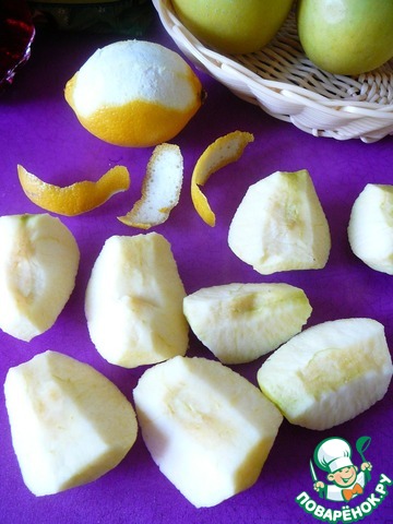 Очищаем яблоки от корочки, косточек (у меня сорт "Голден", так называемая яблоко-груша). Цедру с лимона снимаем толсто. Нам предстоит ее потом вынуть из варева.