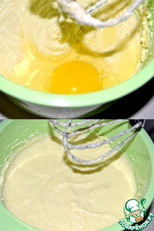 Добавляем по одному все яйца, каждый раз чуть-чуть взбивая. Затем тщательно перемешиваем смесь.