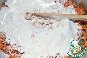 • К натертой моркови добавим сахар, орехи и хорошо перемешаем