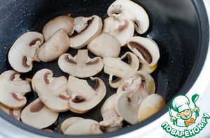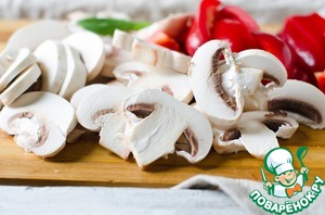 Шампиньоны нарезать ломтиками, а болгарский перец - полосками. -