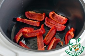 Чашу мультиварки немного сбрызнуть растительным маслом, уложить болгарский перец, немного посолить и выбрать программу Выпечка, установить время 25 минут.