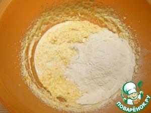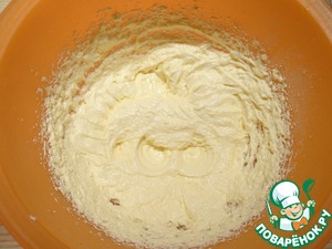 К масляной массе добавляю треть муки и треть молока, ложкой аккуратно перемешиваю массу.
