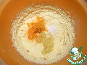 Затем добавляю ванилин, цедру апельсина, натертый на терке корень имбиря. Массу перемешиваю.