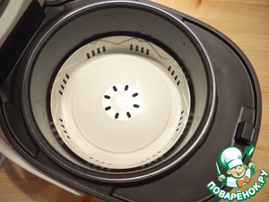 Затем помещаю чашу для готовки на пару (если вода чуть будет заполнять чашу, ничего страшного). Мультиварку включаю на программу "Варить", пока не закипит вода.
