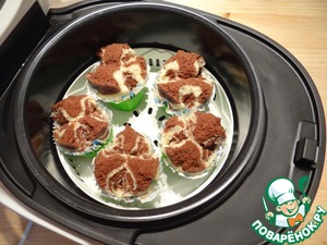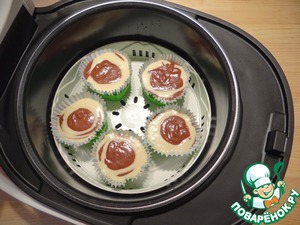Когда вода в мультиварке закипит, выкладываю формы с тестом в чашу для готовки на пару. Кексы готовлю при закрытой крышке на программе "На пару".