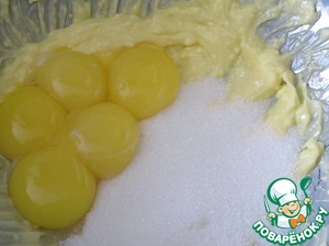 Мягкое масло, сахар и желтки взбить миксером, примерно 5 минут.