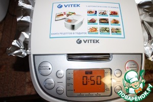 У меня мультиварка Vitek 4203 SR. Знаю, что верх мультиварка никогда не подрумянивает, я попробовала обмануть свою чудо-машину и сделала вот такую конструкцию: на чашу мультиварки положила лист фольги, глянцевой стороной внутрь, чтоб был отражатель, а напротив отверстия для выхода пара проделала дырочку. скрестила пальцы, включила на режим выпечка на 50 минут и стала ждать. Открывать из любопытства боялась)))