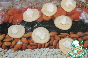 Тесто раскатать толщиной 1 см, вырезать стаканом кружочки, выложить на каждый кружочек по чайной ложке начинки