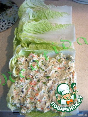 Немного овощей, зелени в сочетании с творогом, сыром и майонезом, закрученное в качанчик китайской капусточки.. очень вкусная и красивая закусочка получается
