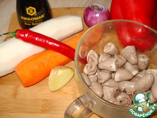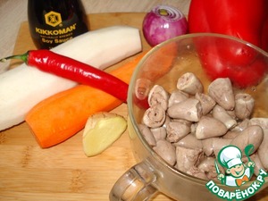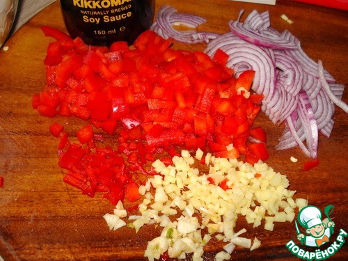 Лук режем полукольцами, перец чили, имбирь и чеснок мелкими кубиками. Болгарский перец небольшими кусочками.