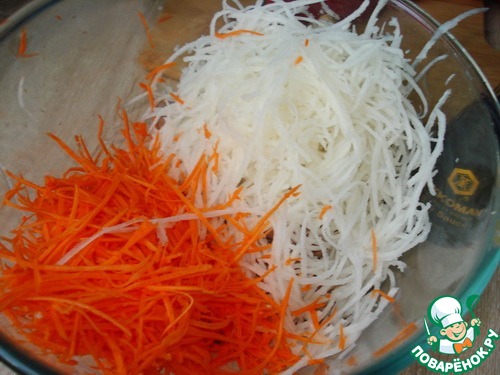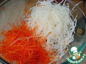 Затем промываем холодной водой. После этого нарезаем их тонкими пластиночками.