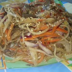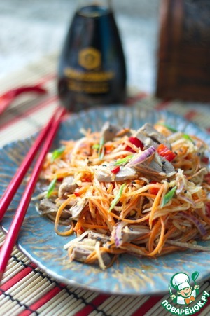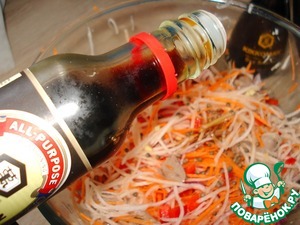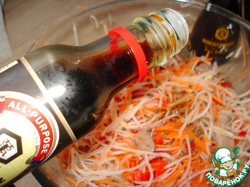 На сковороде раскаляем кунжутное масло и поливаем салат, перемешиваем.