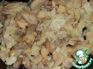 4)Обжариваем мелкорубленый лук до мягкости, добавляем резанные отваренные грибы, обжариваем минут 5.