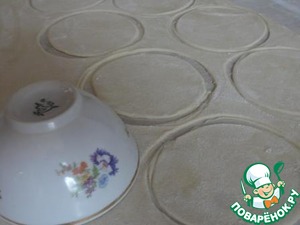 6)Раскатываем тесто толщиной 0,5 см. вырезаем на нём круги пиалой диаметром 11см. Всего должно, получится 16 тюльпинчиков.