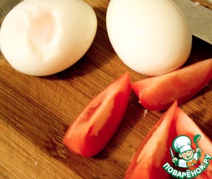 Яйца и помидоры нарезаем полумесяцами и выкладываем в тарелки.