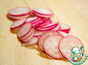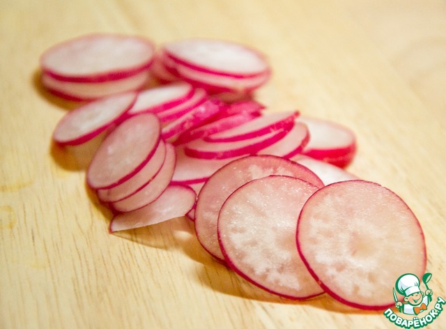 Редис нарезать на тоненькие кружочки. Прям тонюсенькие!