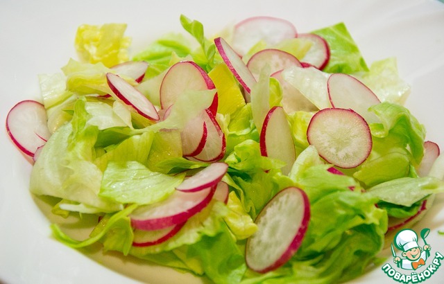 На тарелку выложить крупные хлопья салата, на него — редис.