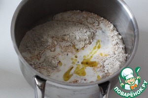 Просейте оба вида муки с содой, добавьте кунжут и овсяные хлопья.