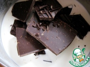Далее делаем ганаш: сливки 80 мл и шоколад поставить на огонь и подогревать до растворения.