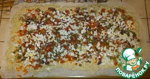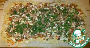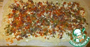 Теперь перец с помидорами. Достаем из холодильника маринованный лук и выкладываем сверху равномерно по лавашу