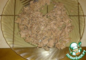 Из банки с тунцом сливаем сок, выкладываем на тарелку и разбираем тунца на волокна