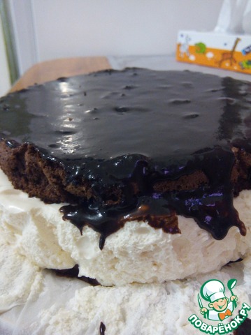 В первый день торт мне не очень понравился. Вкус показался плоским, а вот вечером второго дня корж немного размок, правда и джем стал потихоньку выливаться... И торт показался мне намного вкуснее, нежнее и лучше. Действительно, нежное воздушное суфле, масло не чувствуется, главное тщательно взбить до однородности. Что касается шоколада, то тот факт, что он был для глазурей ничего не изменил - резаться он не очень хотел. Так что, все-таки нужно добавлять сливки, молоко и тп.