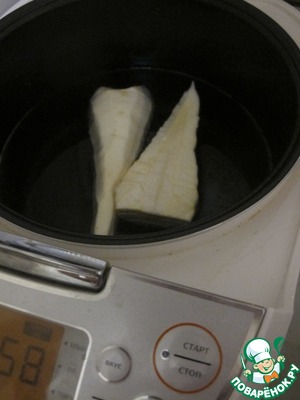 Пастернак очистить, разрезать пополам и развалить в подсоленной воде. У меня ушло 45 минут, на режиме "Суп" при закрытой крышке.