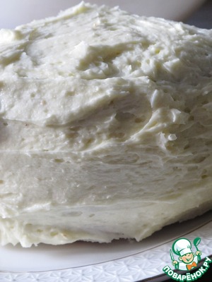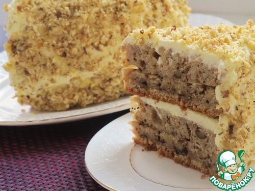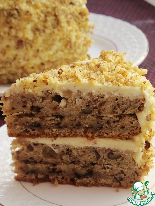 Положить верхний корж, сверху и по бокам обращать кремом, отсылать измельченный и грецкими орехами.