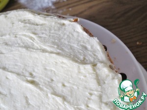 Готовый корж остудить, разрезать на две части по горизонтали, нижнюю намазать третей частью крема.