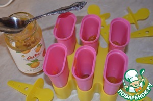 Берем формы для фруктового льда или мороженного, в каждую добавляем по 1 чайной ложке низкокалорийный конфитюр «Darbo» абрикосовый. И заливаем полученной смесью. Отправляем в морозилку на 3-4 часа. После чего угощаемся!!!