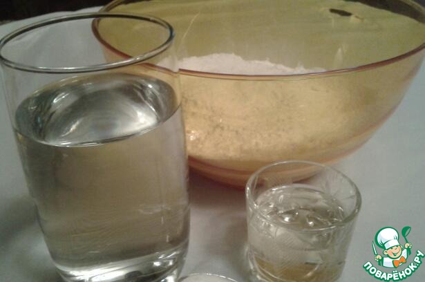 Начнем! Половину муки высыпаем в емкость для замешевания! Растворяем 1 ч. л. соли в воде!