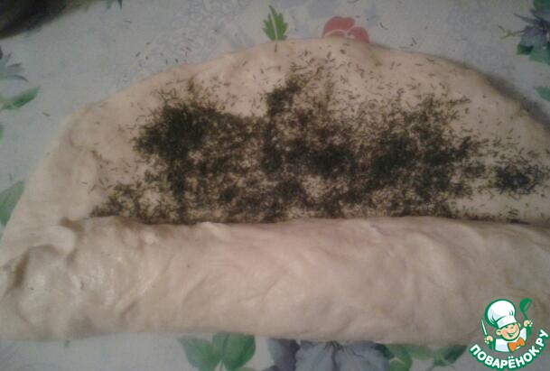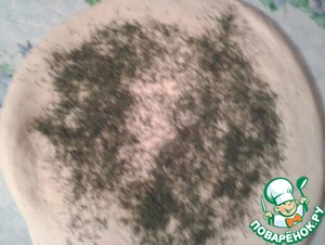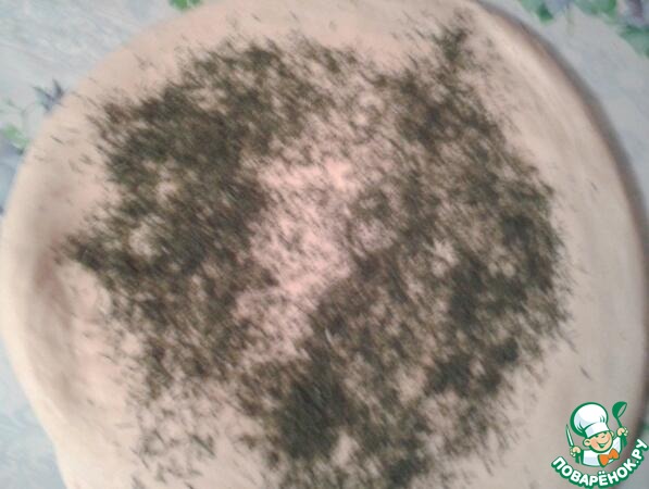Терерь раскатываем тесто толщиной 5-7мм и посыпаем его 1 ( одной ) ст. л. прованских трав! У меня фирмы " Kotami "! В списке этих трав нет и я пишу о них в описании! Это очень важная деталь в нашем рецепте! Мы это будем делать дважды! Т. е. у нас уйдет 2 (две) ст. л. сухой зелени!