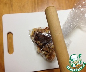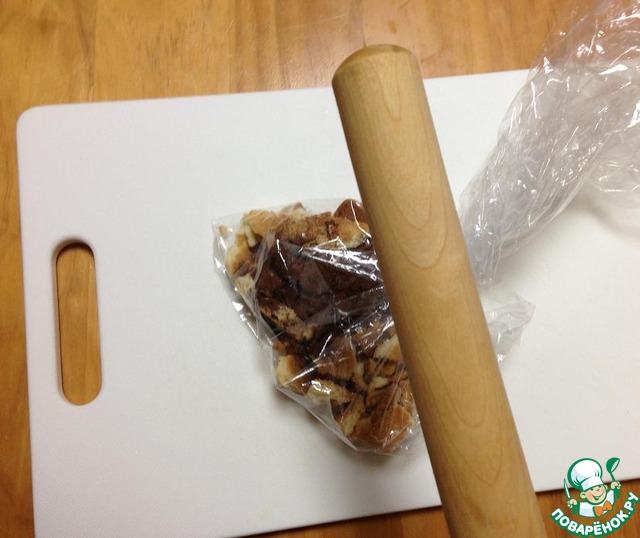 Печенье сложить в пакет и скалкой разбить его в крошки.