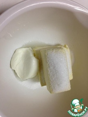 Приготовим начинку для чиз-кейка. Берём сыр "филадельфия", растираем его с сахаром и сметаной.