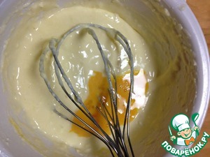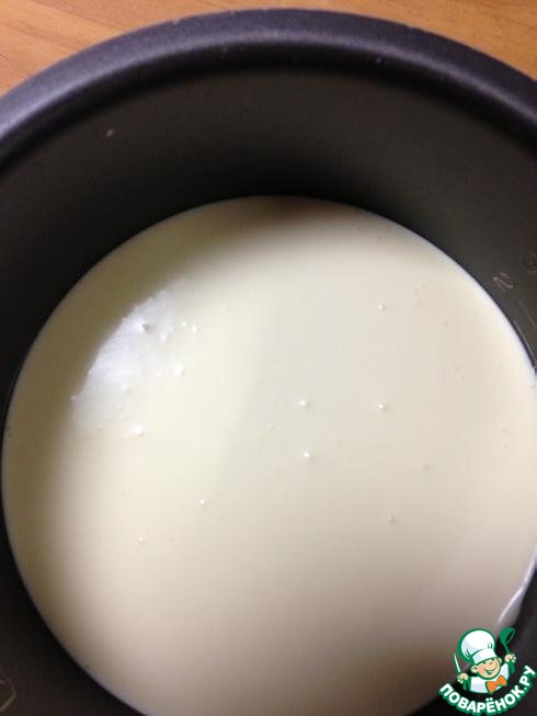 Залить образовавшимся кремом песочно-масляное тесто и несколько раз ударить осторожно об стол, чтобы вышли пузырьки воздуха. После этого чашу поставить в мультиварку и закрыть крышку.