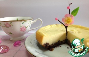 Вставить в чашу мультиварки подходящую тарелочку, которая войдёт до дна чаши, осторожно перевернуть чизкейк и вытащить наружу, потом ещё раз перевернём на то блюдо, в котором будем подавать. Украсить чиз-кейк можно шоколадно-карамельной веточкой сакуры.