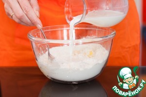 Вливая теплое молоко вымесить тесто. Сначала оно будет липким, но удержитесь от соблазна добавить муки, продолжайте вымешивать