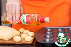 Приготовьте формочки для маффинов, в каждую ячейку налейте примерно чайную ложку растительного масла. Это и будет наш "экономный" фритюр. Причем экономный можно и не брать в кавычки, поскольку если вы хоть раз жарили что-нибудь во фритюре, то примерно представляете, какое огромное количества масла уходит на этот процесс, сколько масла впитывается в продукт во время обжаривания и насколько эта пища становится вредной и калорийной... но и вкусной, эх.))) При таком методе обжаривания мы сохраняем основной принцип приготовления пончиков - во фритюре, но с минимальным впитыванием масла и с мизерным его расходом. Убиваем двух зайцев, ага)