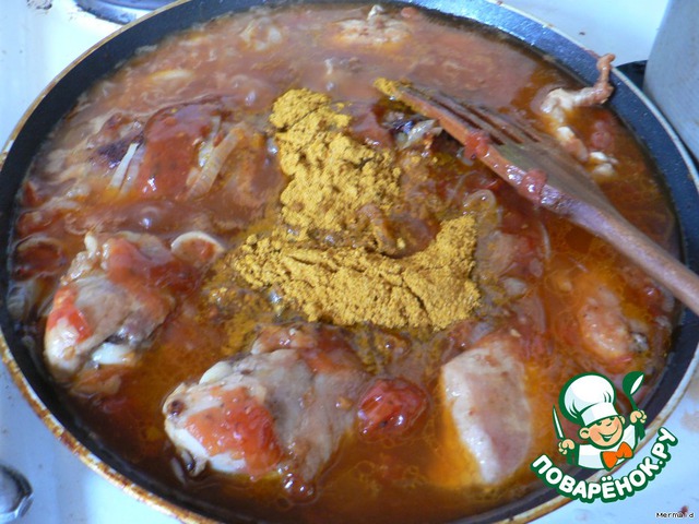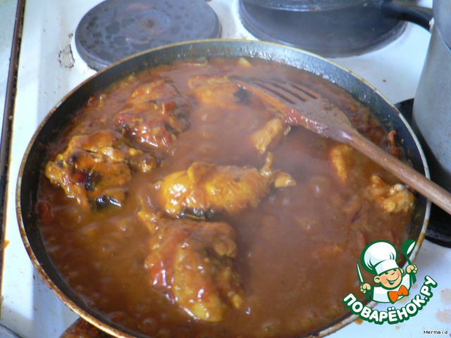Все перемешивайте время от времени. Вода должна немного выкипеть, но соус все равно должен остаться. Так что смотрите по объему. На фотографии еще многовато воды. Тушиться еще минут пять. Пороверьте курицу, она должна быть мягкой и отставать от косточек.