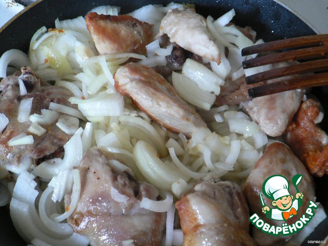 Обжарьте курицу до золотистой корочки и добавьте лук, перемешайте. Пусть тоже поджаривается.