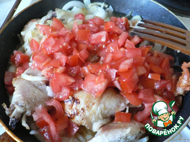 Подождите, пока лук не станет тоже золотистым, и выложите помидоры в сковородку. Перемешайте. -