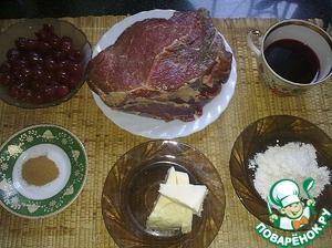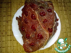 В мясе вдоль волокон сделать глубокие проколы и нашпиговать вишнями, посолить.