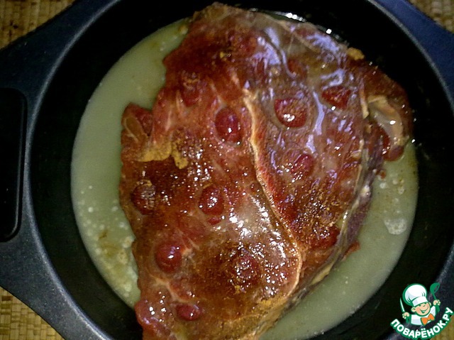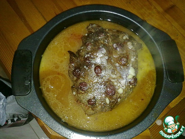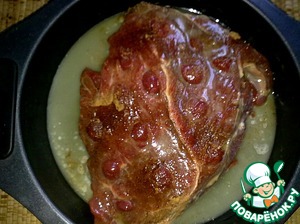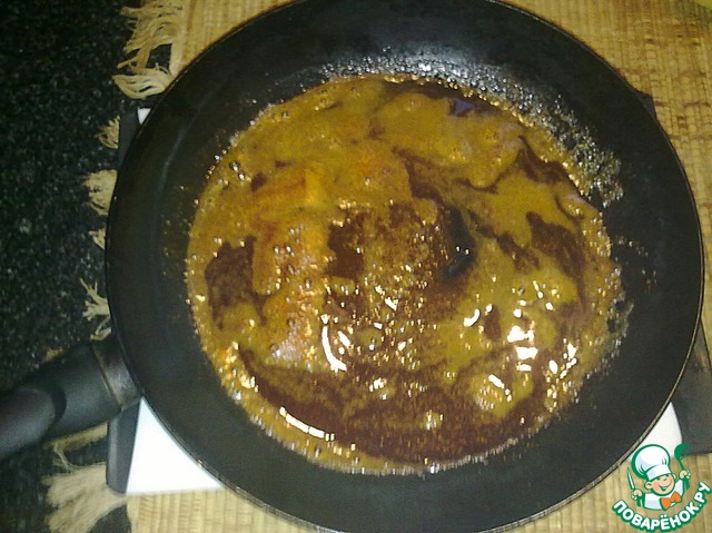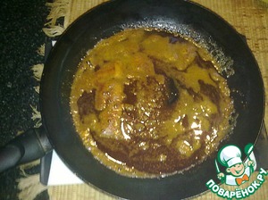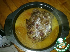 В глубокую емкость положить мясо, политое растопленным маслом и посыпанное корицей. Обжарить в духовке до полуготовности при 180град.