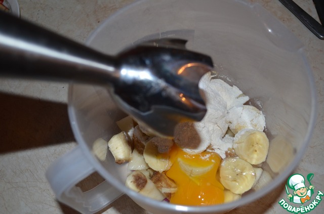 Банан, грушу, яйца, муку и разрыхлитель взбить блендером до однородного состояния.
