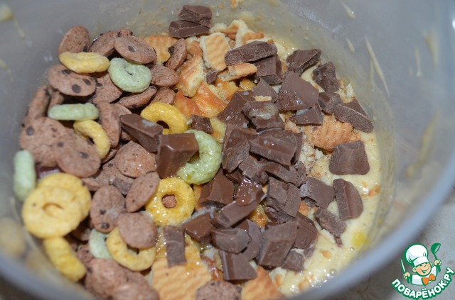 К этой массе добавляем поломанное печенье и шоколад, а также-любые сухие завтраки. У нас в семье сухие завтраки никогда не доедаются до конца-так и стоят коробочки, пакетики с горсткой шариков, хлопьев, колечек... Этот рецепт и ему подобные выручают меня и мои полки частенько. В эту же смесь добавьте растопленное сливочное масло.